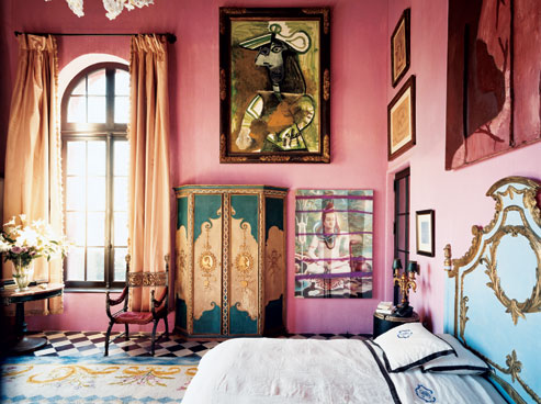In the master suite the bed is tucked away under a linen-draped bamboo pavilion with a curved painted wall separating the bathroom. This screams more African safari than NYC penthouse.